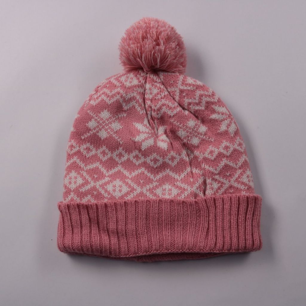 Вязаная шапка с помпоном и жаккардовым узором в розово-белой гамме. Подойдёт для зимних прогулок и повседневной носки в холодную погоду. Мягкая подкладка помогает лучше сохранять тепло и комфортно сидит на голове.