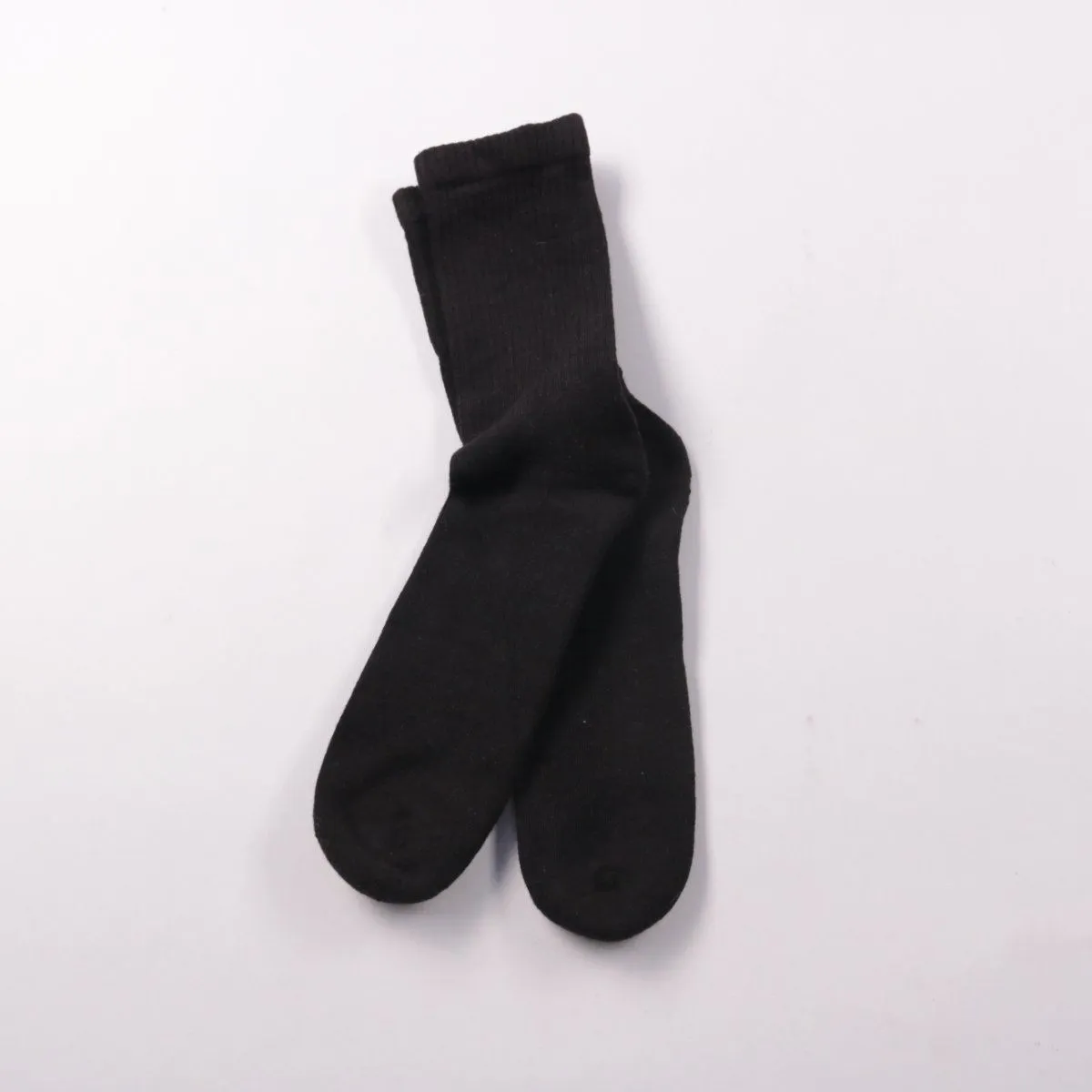 Чёрные однотонные носки с эластичной резинкой без видимого бренда. Подойдут на каждый день и под закрытую обувь в любое время года. Практичны тем, что легко сочетаются с любой одеждой и не маркие.