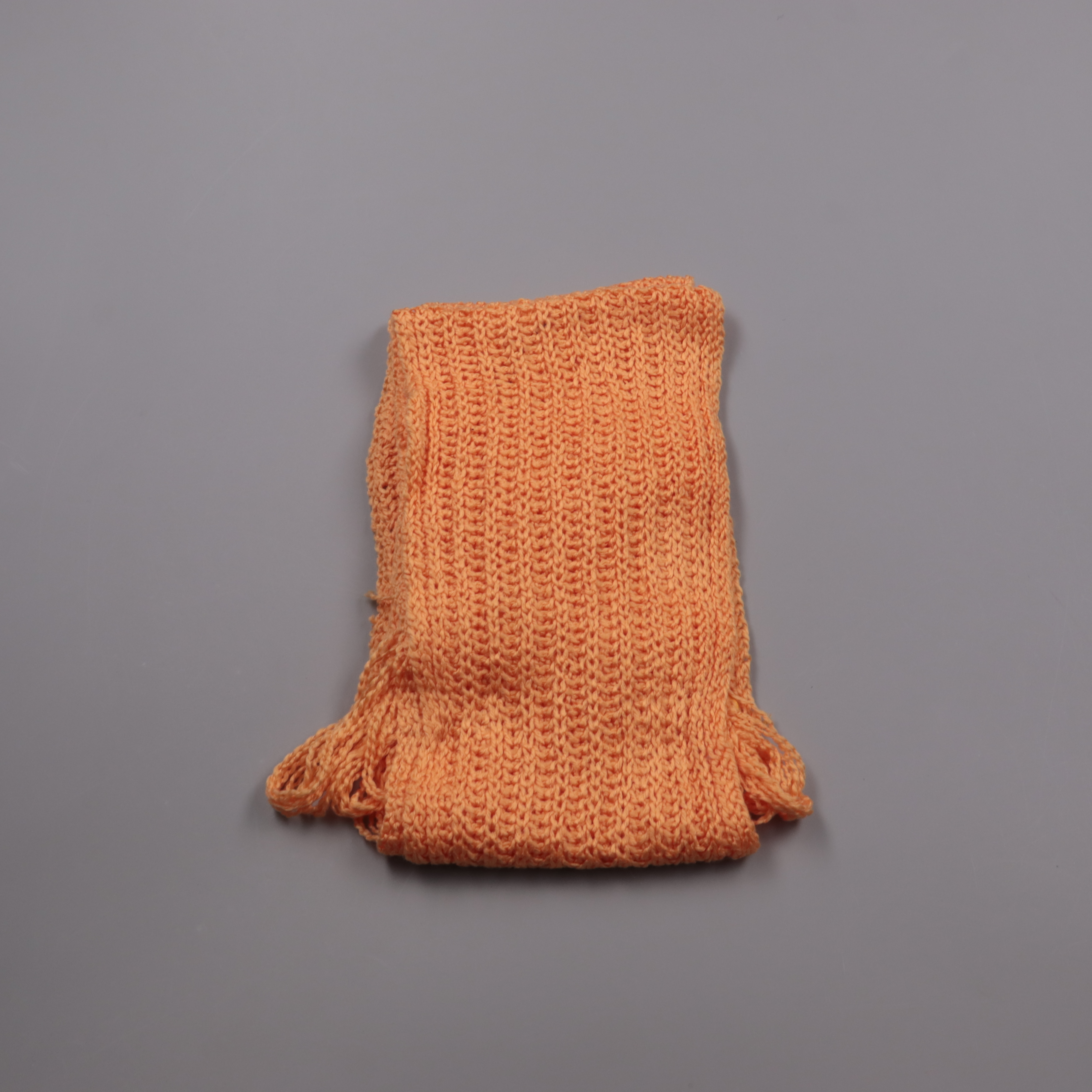 Вязаный шарф в тёплом оранжевом оттенке с кисточками и декоративными лентами на концах. Подойдёт для прохладной погоды и добавит цветовой акцент к базовой куртке или пальто. Мягкая фактура и длинный формат позволяют удобно завязывать разными способами.