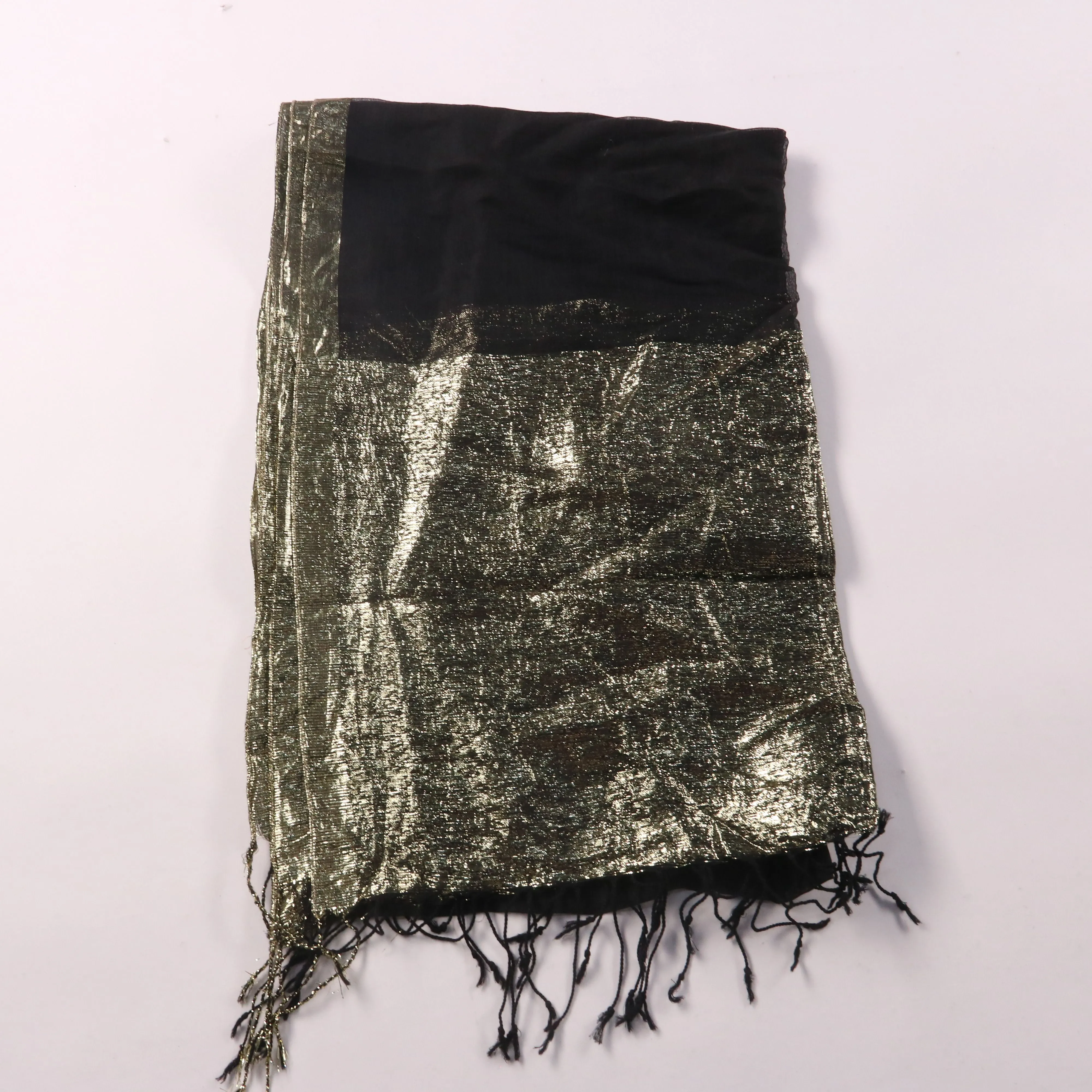 Шарф-палантин в чёрном цвете с металлизированными золотистыми вставками и бахромой по краю. Подойдёт для повседневных образов и как акцент к вечернему наряду. Лёгкая ткань удобно драпируется и быстро добавляет образу фактуру и немного тепла.