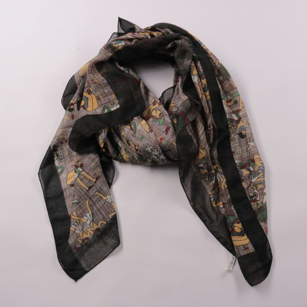 Лёгкий платок с чёрной окантовкой и принтом с фигурными сюжетами в этническом стиле. Подойдёт для повседневных образов и как акцент к однотонной одежде, можно носить на шее или на сумке. Тонкая ткань легко складывается и почти не занимает места.
