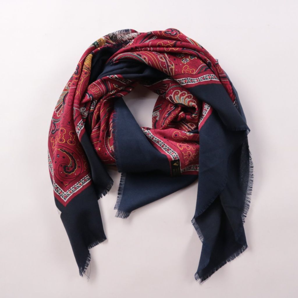 Платок Laura Rossi с узором пейсли и контрастной тёмно-синей каймой, края с лёгкой бахромой. Подойдёт для повседневных образов и для офиса как акцент на шее или на сумке. Большой формат позволяет носить его и как шарф в прохладную погоду.