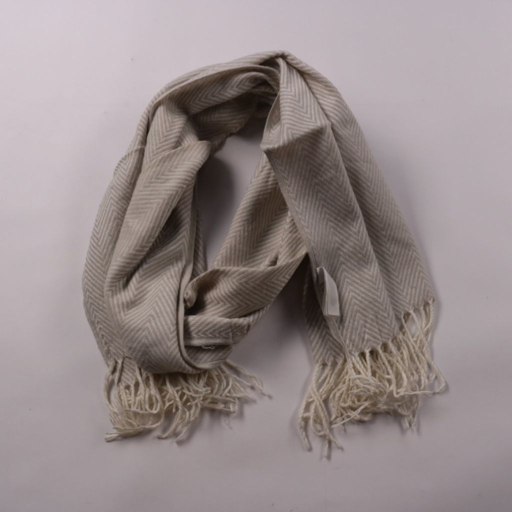Шарф Ar Accessories светло-бежевого цвета с рисунком «ёлочка» и бахромой по краям. Подойдёт для зимы и прохладной демисезонной погоды, хорошо сочетается с пальто и куртками. Практичен тем, что выполнен из 100% акрила и не требует сложного ухода.