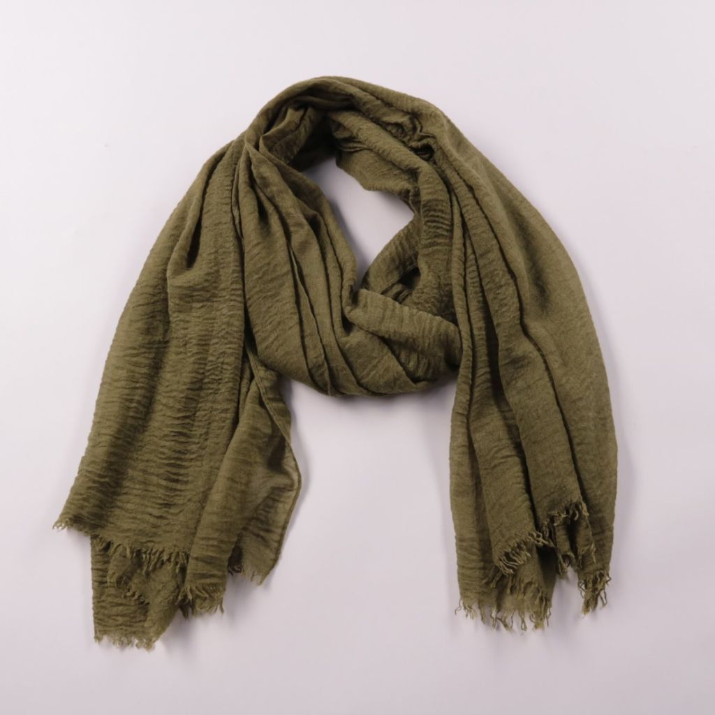 Лёгкий шарф без бренда в оливково‑зелёном цвете, с фактурной жатой поверхностью и бахромой по краям. Подойдёт для повседневных образов в межсезонье и прохладные летние вечера. Удобно носить как шарф или накинуть на плечи — ткань хорошо драпируется.