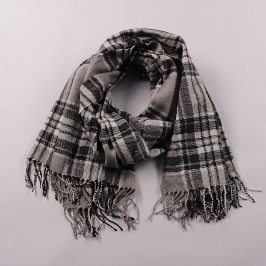 Шарф в серо-чёрную клетку с бахромой, бренд не указан. Подойдёт для повседневных образов в прохладную погоду и легко сочетается с однотонной верхней одеждой. Большой размер позволяет носить его как шарф или накидывать как палантин.