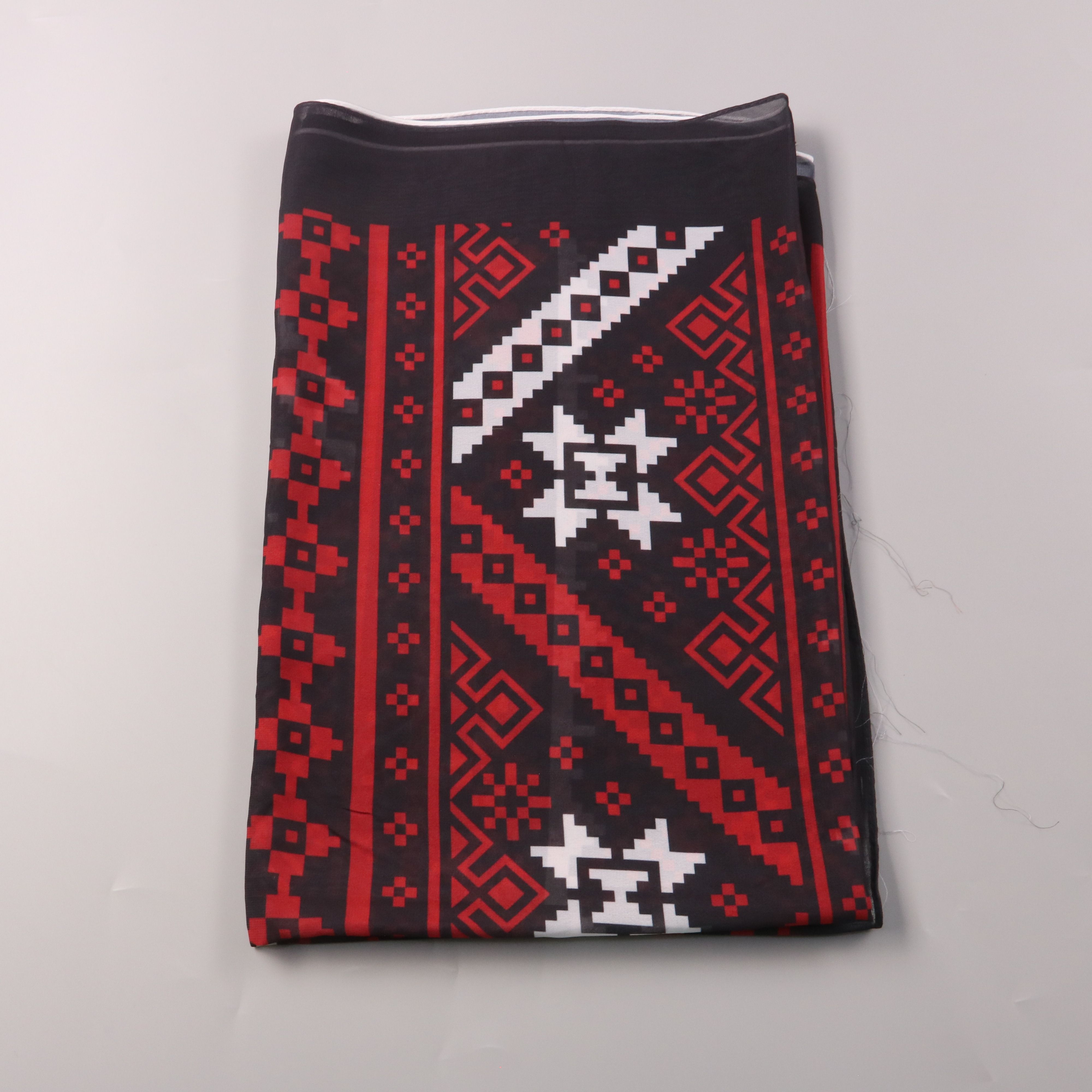 Шарф Ella с геометрическим орнаментом в чёрно-красно-белой гамме. Подойдёт для повседневных образов и как акцент к однотонной верхней одежде в межсезонье. Лёгкий материал удобно драпируется и можно носить разными способами.