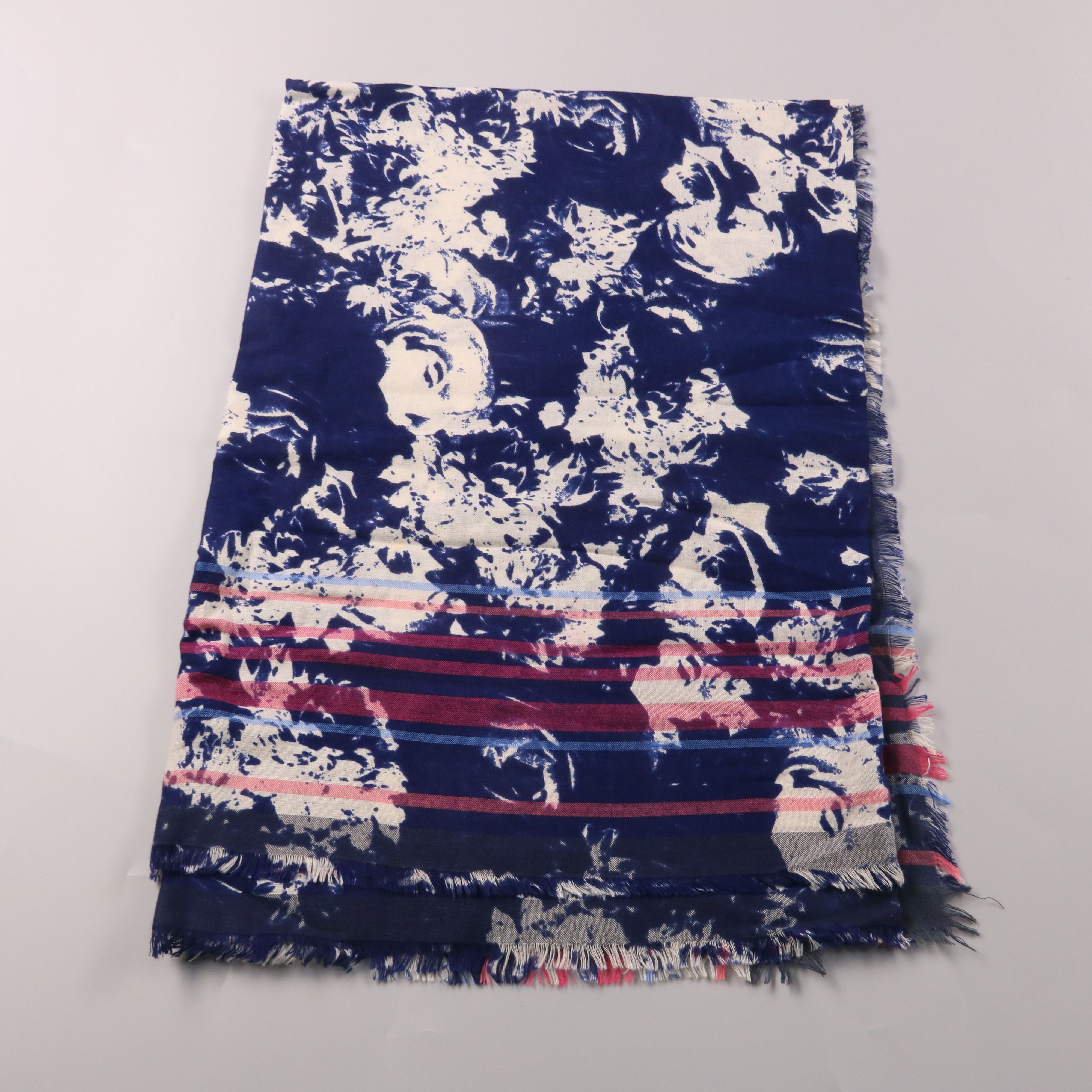 Шарф с бахромой и контрастным принтом в сине-бело-красной гамме. Подойдёт для прохладной погоды в межсезонье и как акцент к базовым курткам и пальто. Практичное преимущество — легко драпируется и добавляет объём без утяжеления образа.