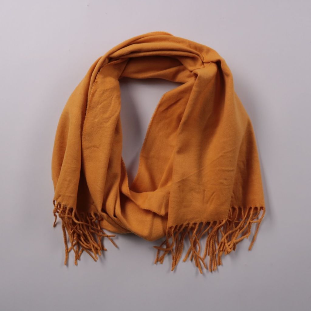Шарф без бренда в однотонном оранжевом цвете с бахромой по краям. Подойдёт для повседневных образов в прохладную погоду и легко сочетается с пальто или курткой. Мягкий материал удобно драпируется и можно носить разными способами.