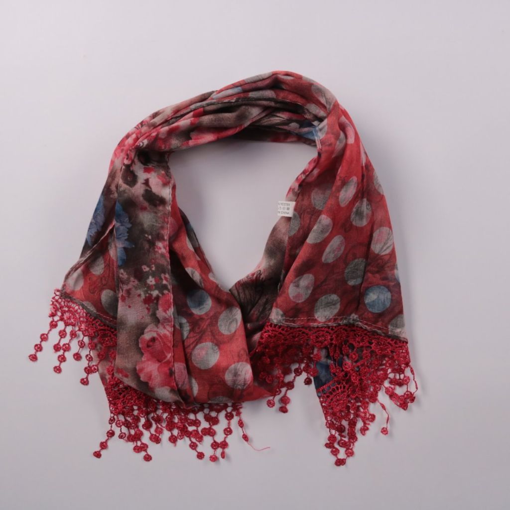 Лёгкий шарф с цветочно-гороховым принтом и кружевной бахромой по краю. Подойдёт для повседневных образов и как акцент к однотонному пальто или куртке в демисезон. Мягкая ткань хорошо драпируется и компактно помещается в сумку.