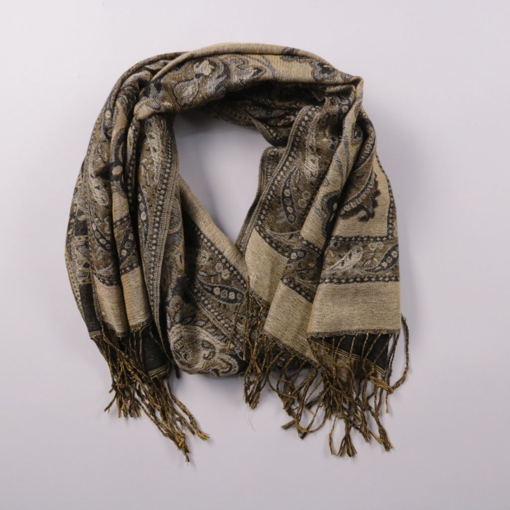 Шарф с узором пейсли и бахромой по краю, бренд не указан. Подойдёт для повседневных образов и как акцент к однотонной верхней одежде в прохладную погоду. Лёгко драпируется и удобно носится благодаря мягкой ткани.