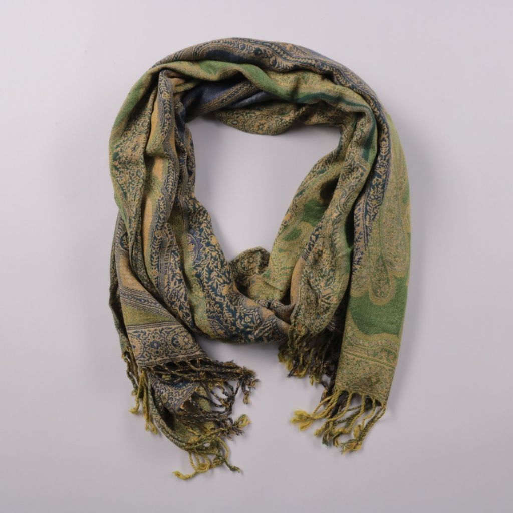 Шарф с орнаментом пейсли и кисточками по краю, в зелёно-сине-бежевой гамме. Подойдёт для повседневных образов в прохладную погоду и как акцент к однотонной верхней одежде. Лёгкий и хорошо драпируется, удобно завязывать разными способами.