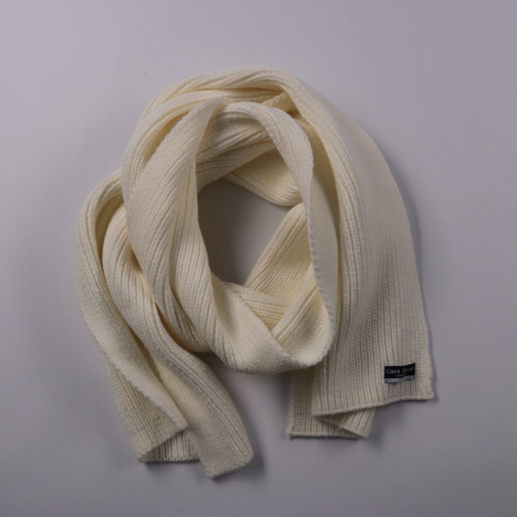 Вязаный шарф Casa Blanca молочного оттенка с фактурной резинкой и нашивкой-логотипом на краю. Подойдёт для повседневной носки в холодный сезон и легко сочетается с верхней одеждой. Мягкая вязка хорошо удерживает тепло и удобно укладывается в один-два о...