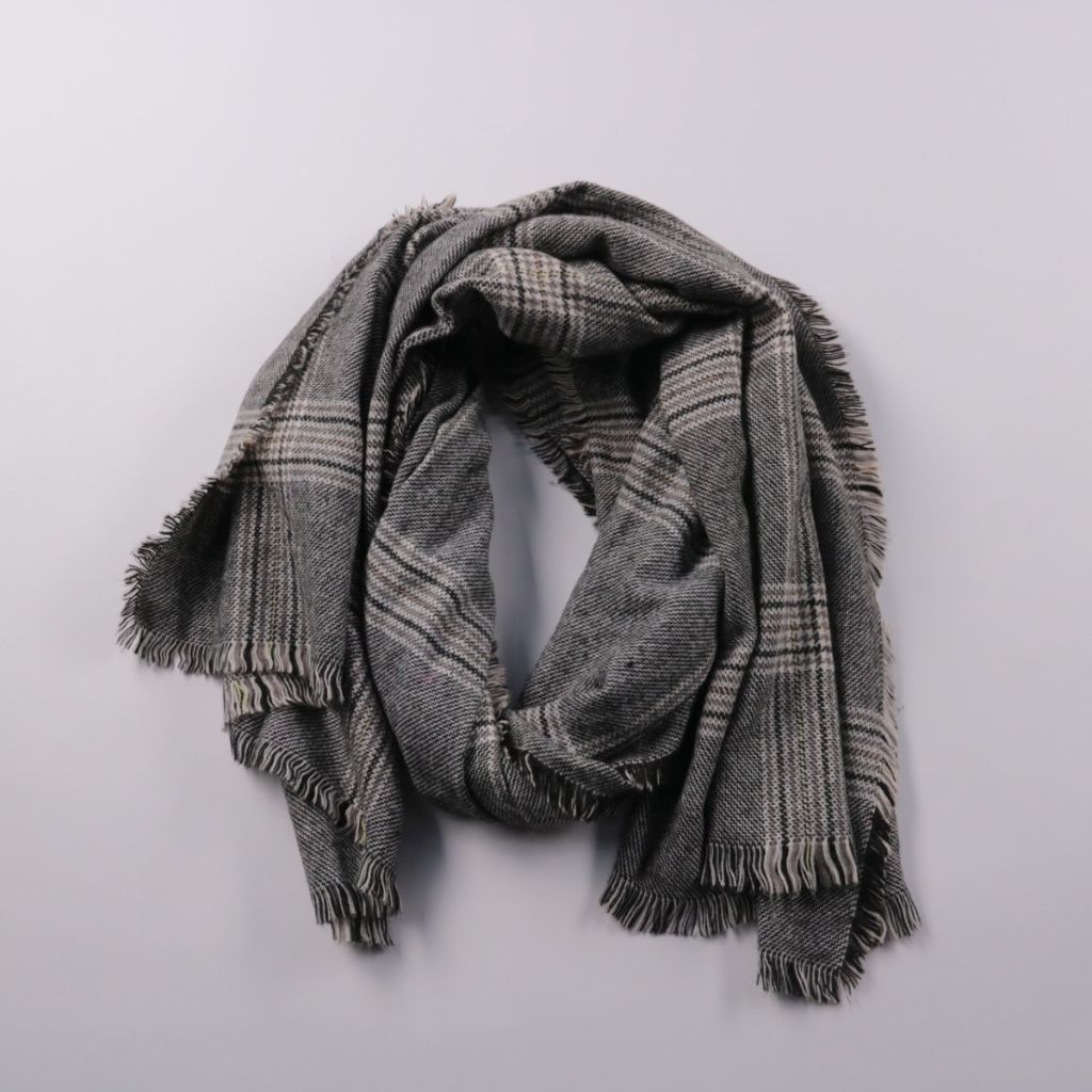 Шарф в серую клетку с бахромой по краям, мягкий и объёмный. Подойдёт для повседневных образов осенью и зимой, можно носить как шарф или накидывать на плечи. Практичное преимущество — хорошо сочетается с базовой верхней одеждой и легко драпируется.