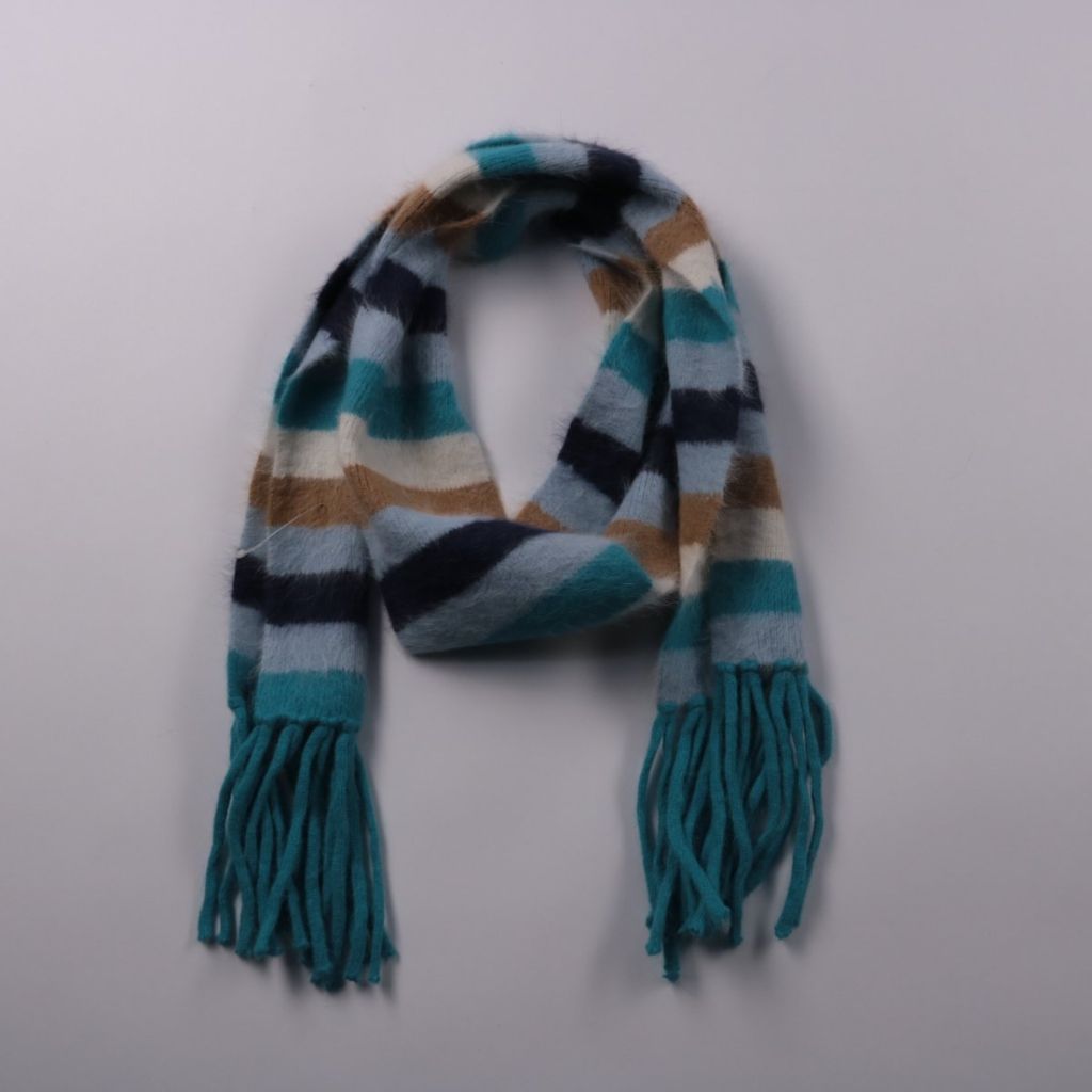 Шарф в полоску с длинной бахромой, мягкий и объёмный на вид. Подойдёт для повседневных образов и прогулок в холодную погоду. Длина позволяет удобно обернуть вокруг шеи и регулировать посадку.