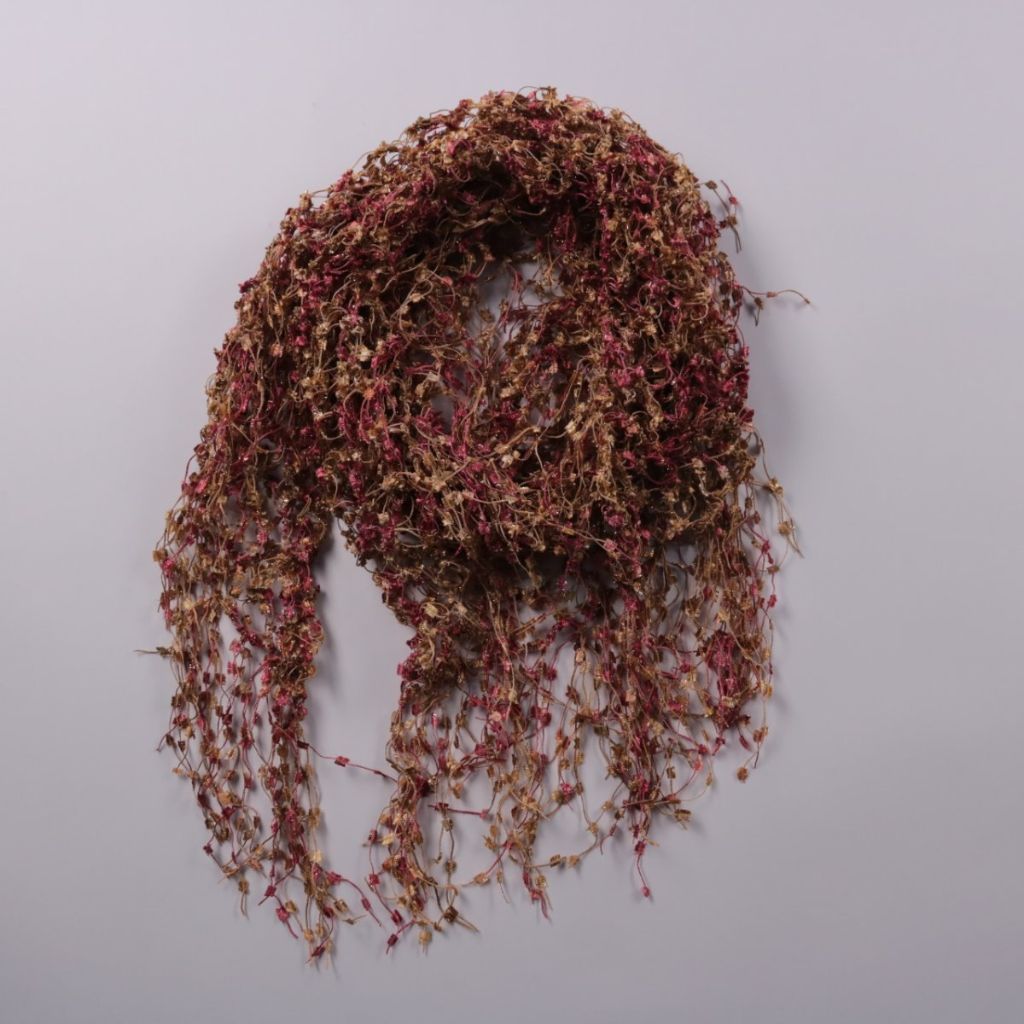 Ажурный шарф-сетка с декоративной бахромой и фактурными узелками в бордово-коричневой гамме. Подойдёт для демисезонных образов и как акцент к пальто, куртке или джемперу. Лёгкий и компактно складывается, удобно брать с собой.