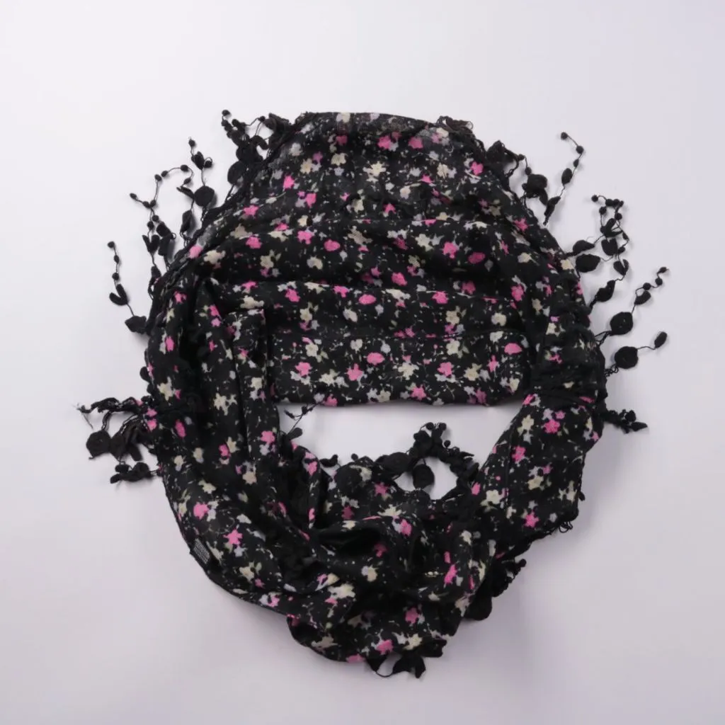 Платок с мелким цветочным принтом на чёрном фоне и декоративной бахромой по краю. Подойдёт для повседневных образов в качестве акцента на шею или на голову. Лёгкий материал удобно складывается и не занимает много места в сумке.