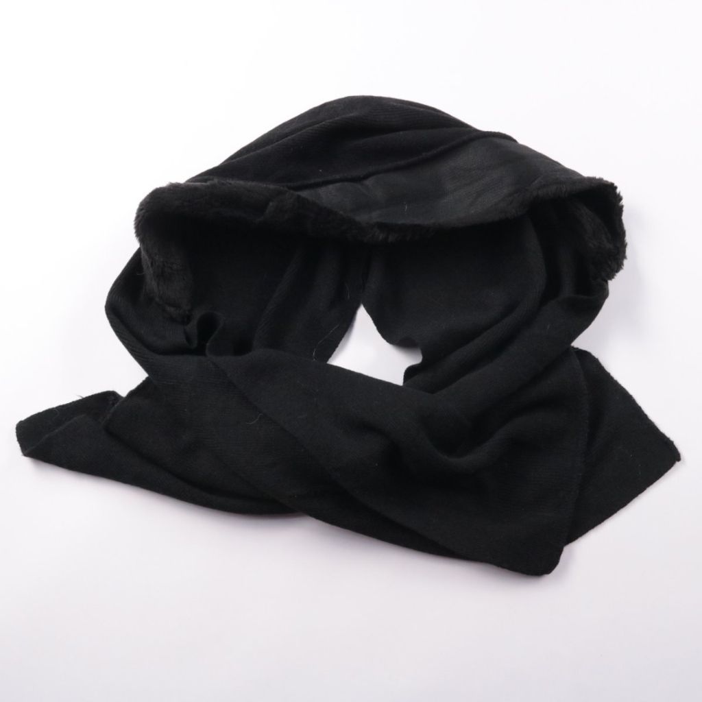 Чёрный тёплый шарф с мягкой меховой отделкой по краю. Подойдёт для зимних прогулок и повседневных образов, можно носить поверх пальто или куртки. Хорошо защищает шею от ветра и сохраняет тепло.