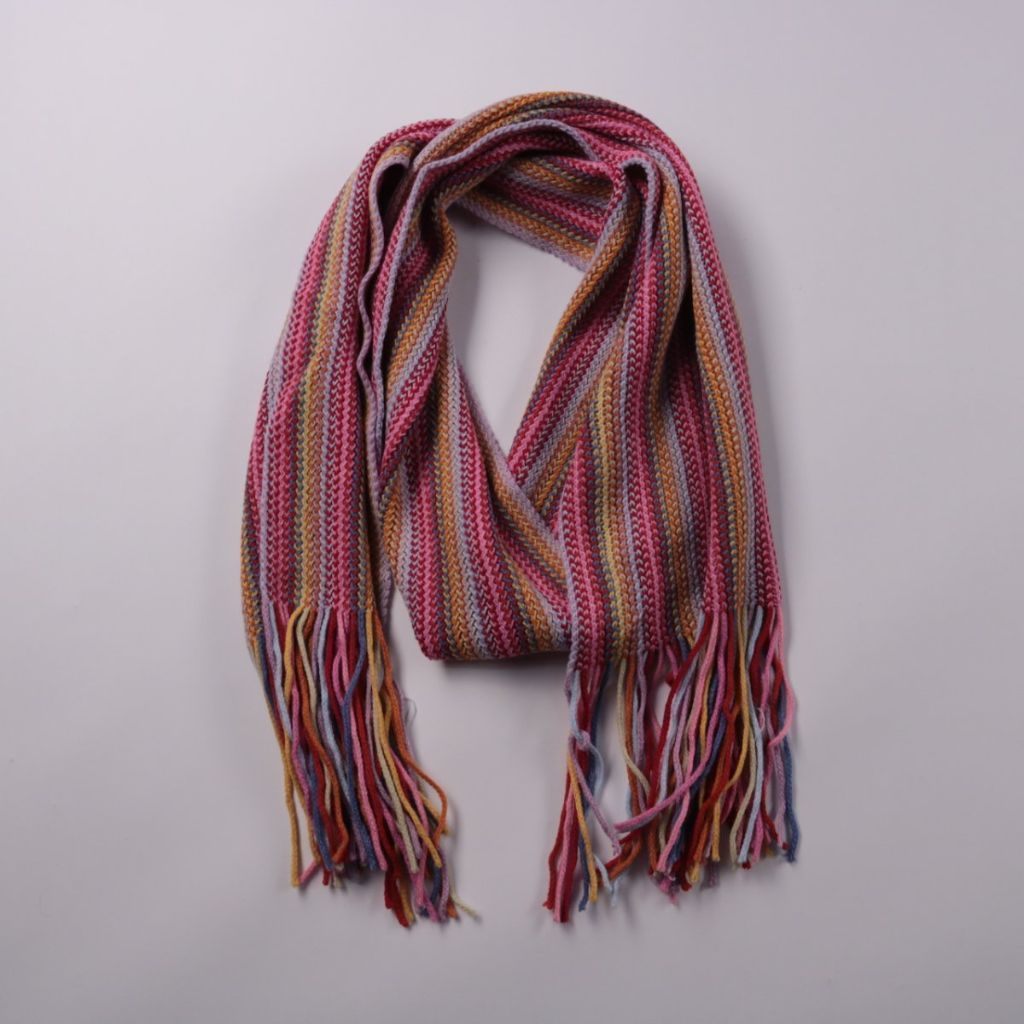 Вязаный шарф в разноцветную полоску с кисточками на концах. Подойдёт для повседневных образов в прохладную погоду и легко сочетается с однотонной верхней одеждой. Длинный формат удобно наматывать в несколько оборотов для дополнительного тепла.
