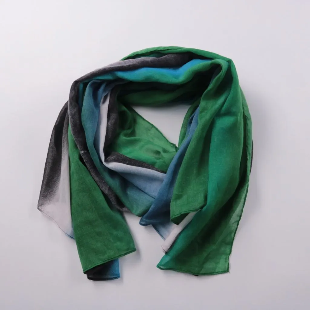 Шарф Celeste из лёгкого полиэстера с градиентной расцветкой в зелёно-сине-чёрных тонах. Подойдёт для повседневных образов и как акцент к однотонной верхней одежде в любое время года. Материал тонкий и быстро сохнет, удобно брать с собой в сумку.