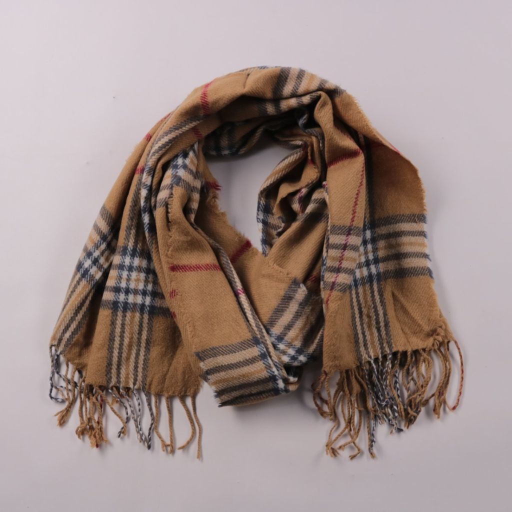 Шарф в бежевую клетку с контрастными полосами и бахромой по краям. Подойдёт для повседневных образов в прохладную погоду и легко сочетается с базовой верхней одеждой. За счёт мягкой ткани хорошо драпируется и удобно укладывается вокруг шеи.