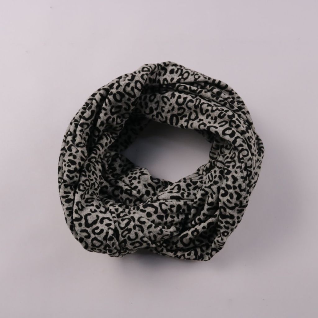 Снуд с леопардовым принтом в серо-чёрной гамме, мягкий и приятный к коже. Подойдёт для повседневных образов в прохладную погоду и легко сочетается с однотонной верхней одеждой. Удобно носить как шарф без завязывания — не сползает и быстро надевается.