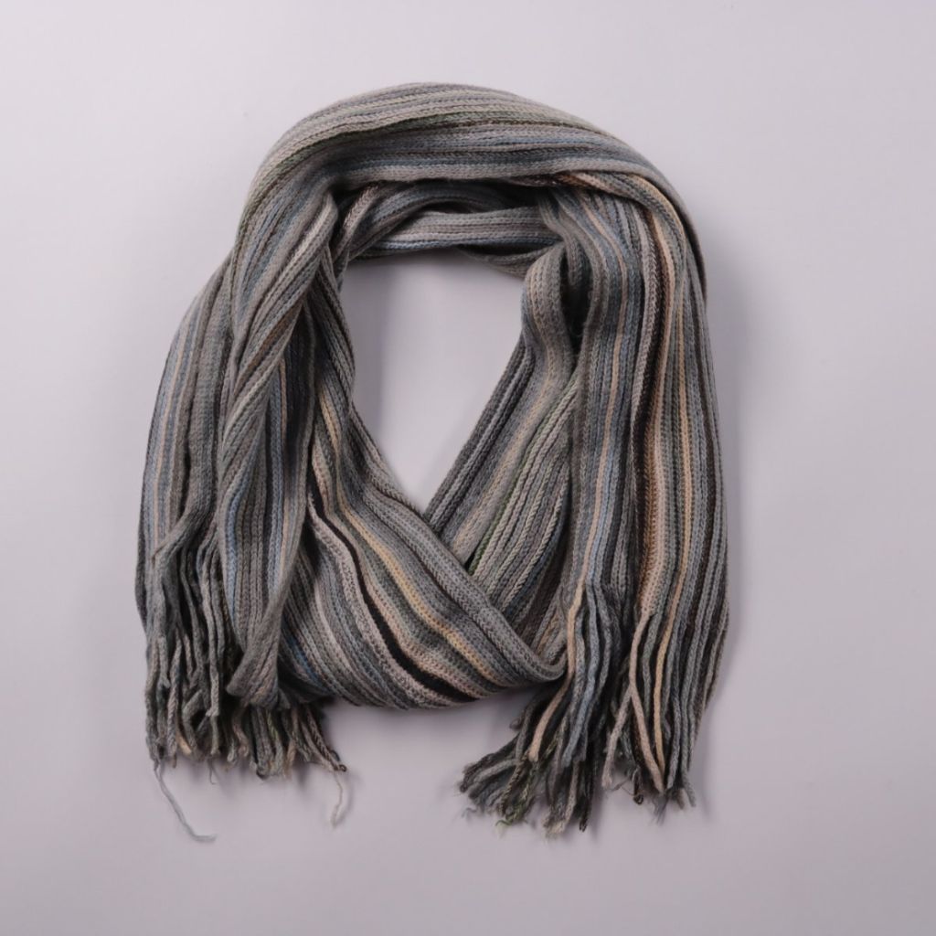 Вязаный шарф в полоску с бахромой, без указания бренда. Подойдёт для повседневной носки в холодный сезон и легко сочетается с верхней одеждой нейтральных оттенков. Плотная вязка хорошо сохраняет тепло и комфортно драпируется.