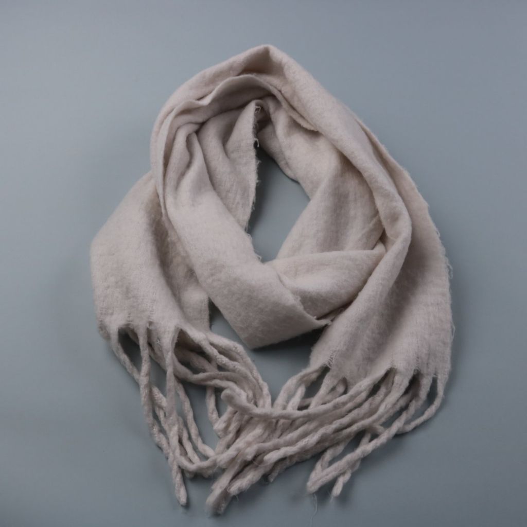 Шарф без бренда в светло-бежевом цвете, мягкий и объёмный, с длинной бахромой по краям. Подойдёт для повседневных образов в прохладную погоду и легко сочетается с базовой верхней одеждой. За счёт ширины удобно драпируется и хорошо закрывает шею от ветра.