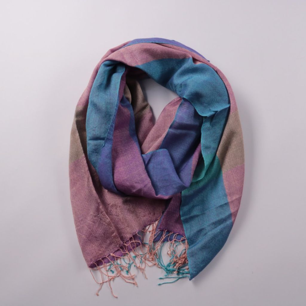 Лёгкий шарф без бренда в крупную клетку с кисточками по краю, в оттенках фиолетового, синего и зелёного. Подойдёт для повседневных образов и в качестве акцента к однотонной верхней одежде в демисезон. Мягко драпируется и можно носить как шарф или накин...