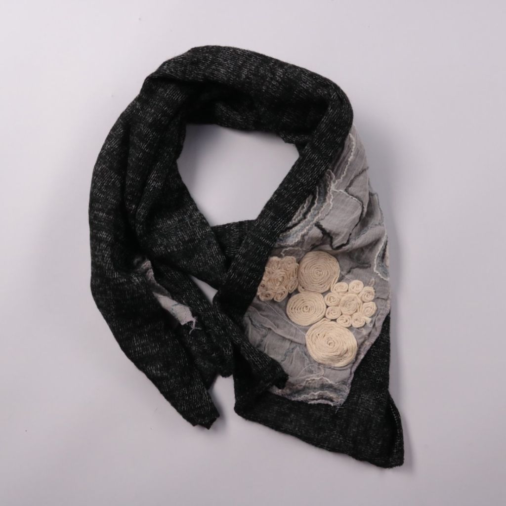 Шарф без указанного бренда, выполнен в тёмно-серой/чёрной гамме с декоративной вставкой и объёмным текстильным декором. Подойдёт для повседневных образов в прохладную погоду, можно носить как классический шарф или накидывать на плечи. Мягкий материал п...