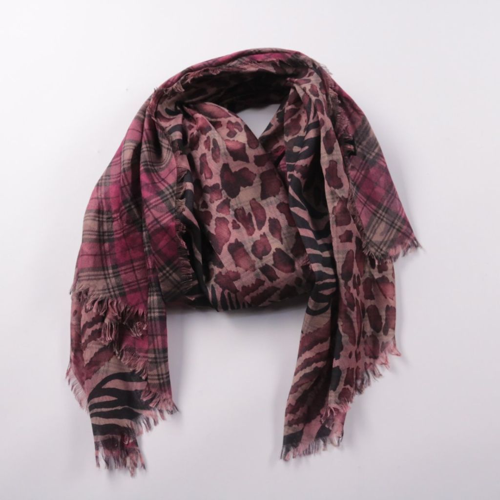 Шарф из 100% вискозы с комбинированным принтом (клетка и анималистичный) и бахромой по краю. Подойдёт для повседневных образов и как акцент к однотонной верхней одежде в межсезонье. Лёгкий материал удобно драпируется и не занимает много места в сумке.