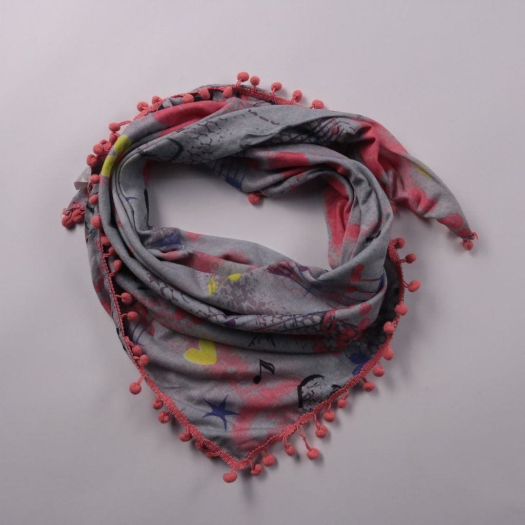 Треугольный платок с декоративной отделкой помпонами по краю, без указанного бренда. Подойдёт для повседневных образов и как яркий акцент на шее или на голову в прохладную погоду. Лёгкий материал удобно складывается и не занимает много места в сумке.