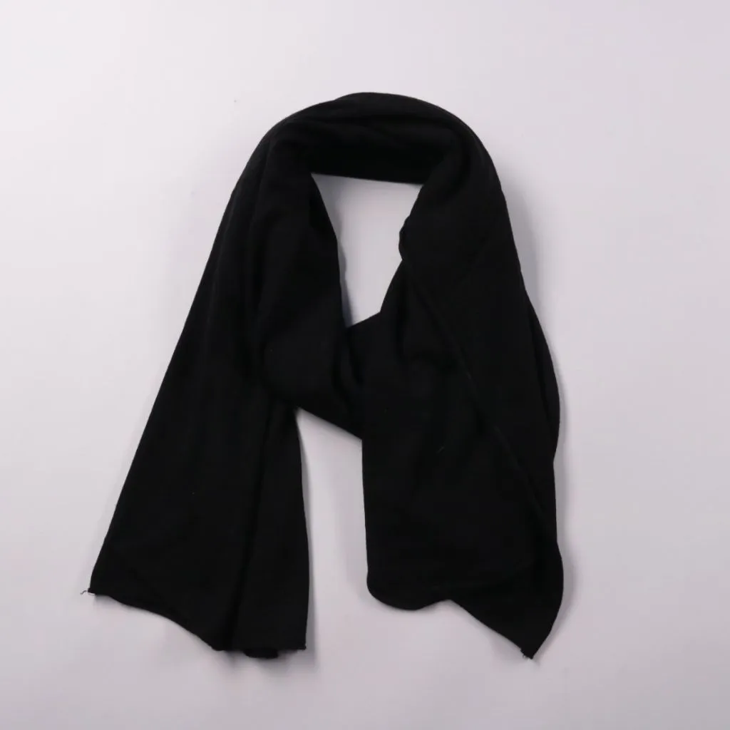 Чёрный шарф без заметных логотипов, тонкий и мягко драпируется. Подойдёт для повседневных образов и в прохладную погоду как лёгкий слой. Компактно складывается и удобно носить с собой.