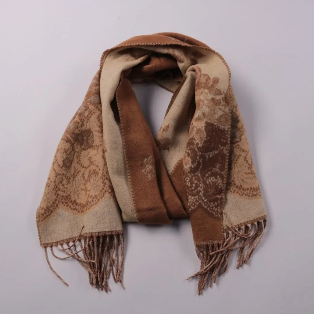 Шарф без бренда в бежево-коричневой гамме с цветочным узором и бахромой по краям. Подойдёт для повседневных образов в прохладную погоду осенью и весной. Мягко драпируется и добавляет тепло без лишнего объёма.