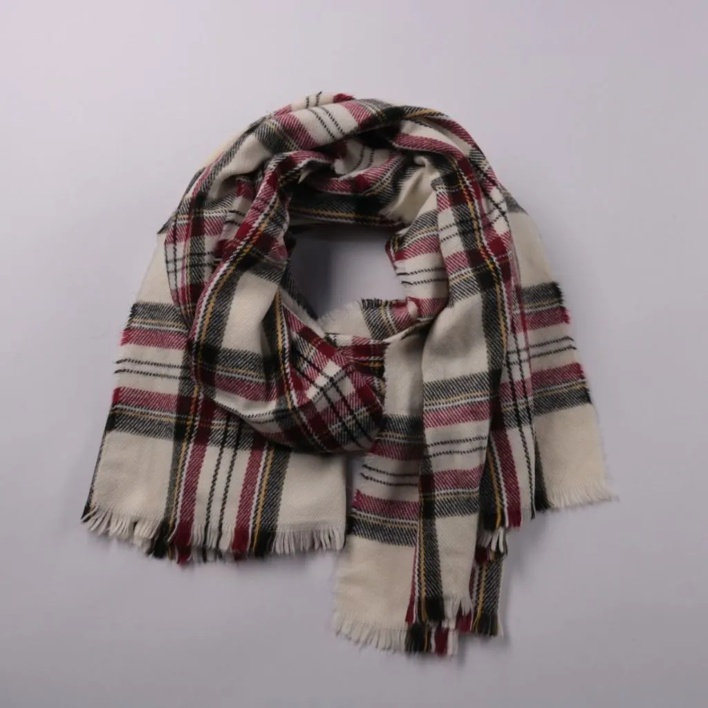 Шарф в клетку с бахромой по краям, мягкий на ощупь. Подойдёт для повседневных образов с пальто или курткой в прохладную погоду. Удобно драпируется и добавляет тепла за счёт широкого полотна.