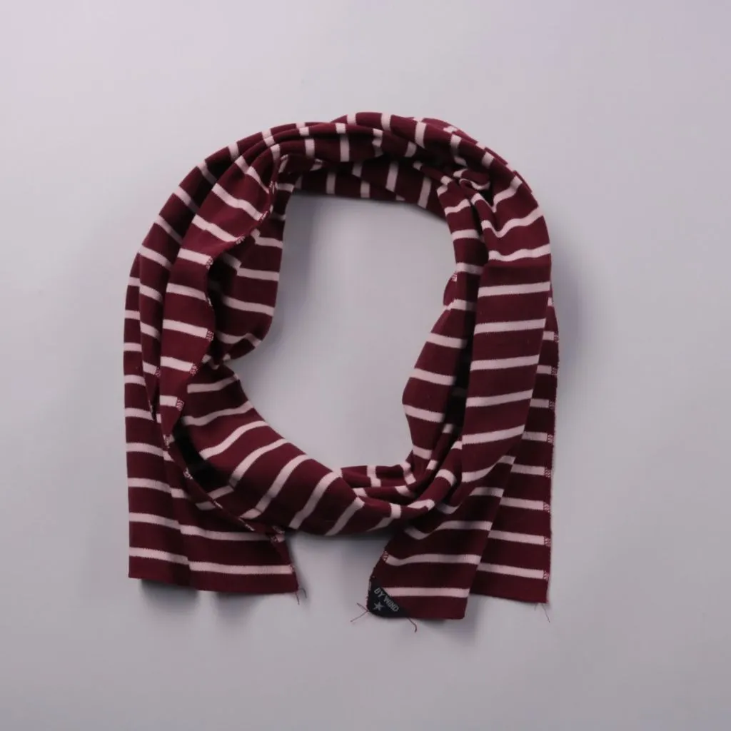 Полосатый шарф BY NND бордового цвета с белыми полосами, из тонкого трикотажа. Подойдёт для повседневных образов и лёгкой прохлады весной или осенью. Компактно складывается и не занимает много места в сумке.