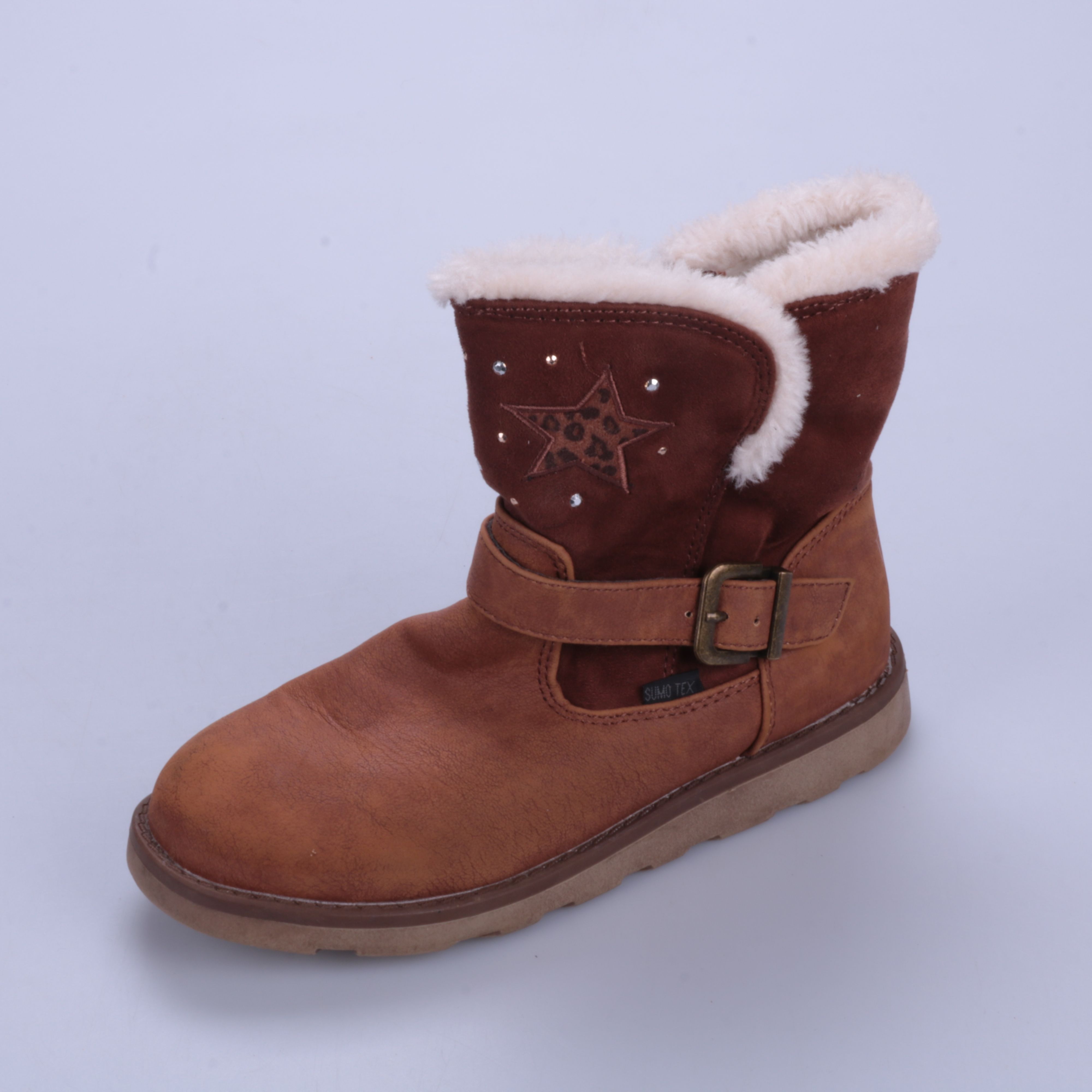 Зимние полусапоги Siemes коричневого цвета с тёплой искусственной меховой подкладкой и декоративными стразами. Подойдут для прогулок в холодную погоду, застёжка-молния и ремешок помогают удобно фиксировать обувь на ноге. Рельефная подошва даёт лучшее с...