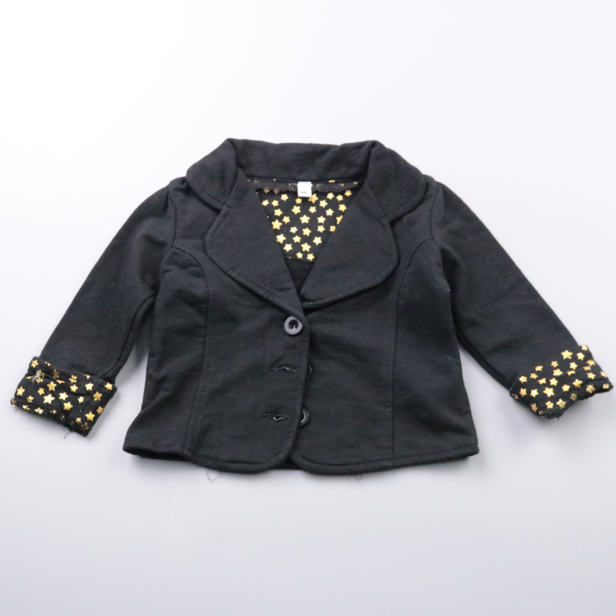 Детский пиджак с отложным воротником и золотистым принтом со звёздами на подкладке и манжетах. Подойдёт для праздников и фотосессий, а также на выход в детский сад. Удобно застёгивается на пуговицы и легко сочетается с платьем или брюками.