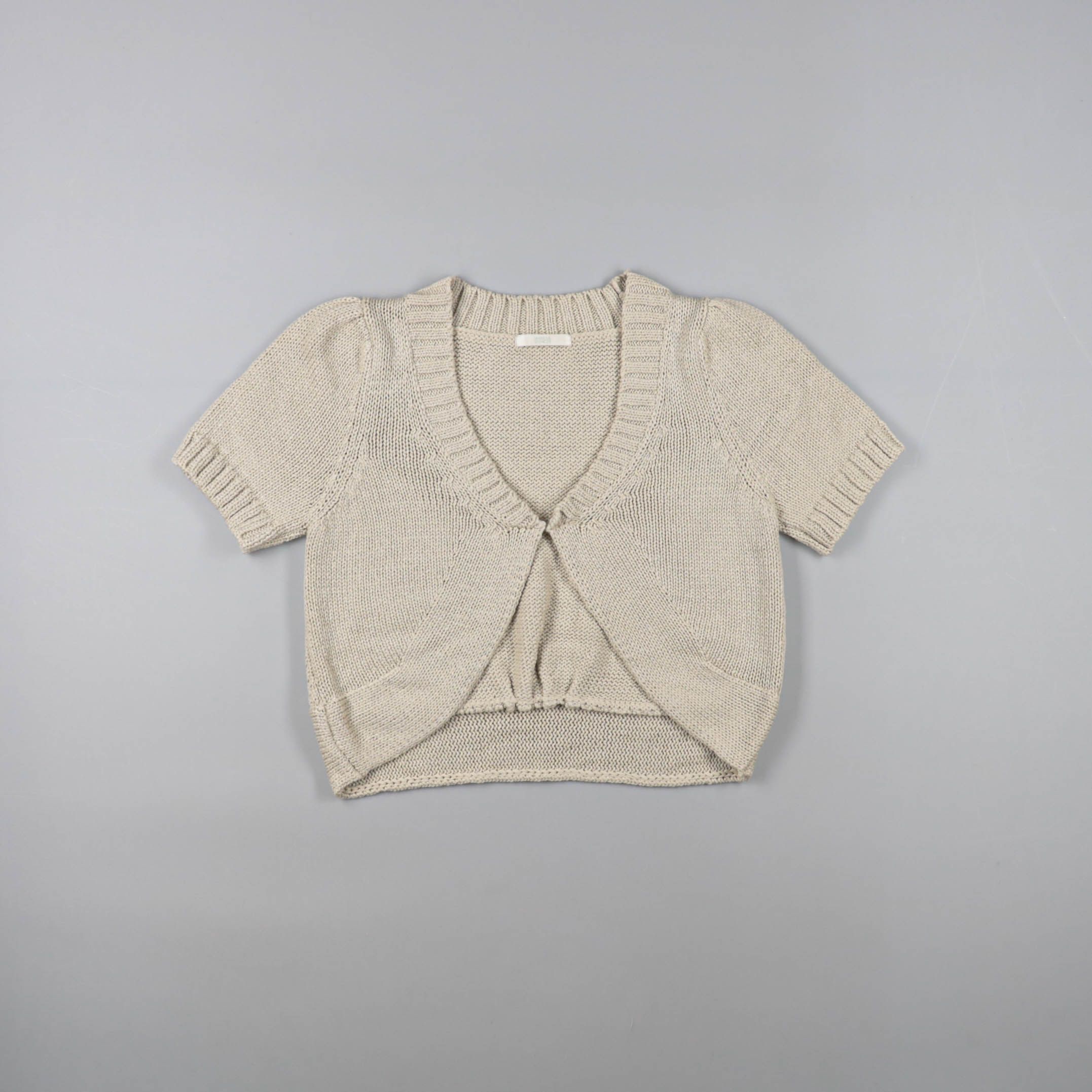 Вязаная кофта для девочки в бежевом цвете с коротким рукавом и V-образным вырезом, спереди эффект болеро. Подойдёт для садика, школы и прогулок в прохладную погоду как второй слой. Легко сочетается с платьями и футболками и не стесняет движения.
