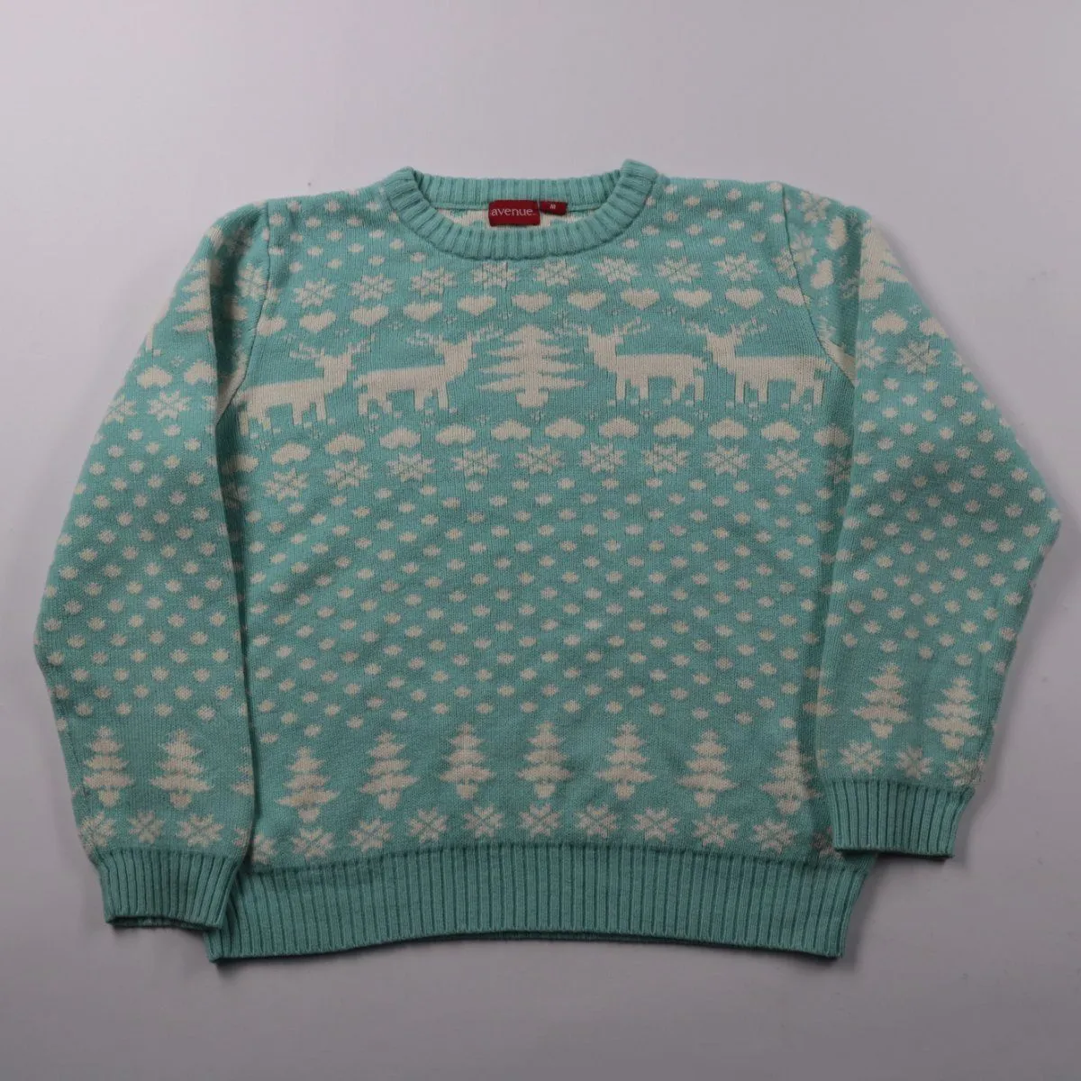 Вязаный свитер Avenue мятного цвета с зимним орнаментом (олени и ёлочки). Подойдёт для прогулок и детского сада в холодное время года, комфортно носить как самостоятельный слой или под куртку. Практичный акриловый состав (100%) легко стирается и быстро сохнет.