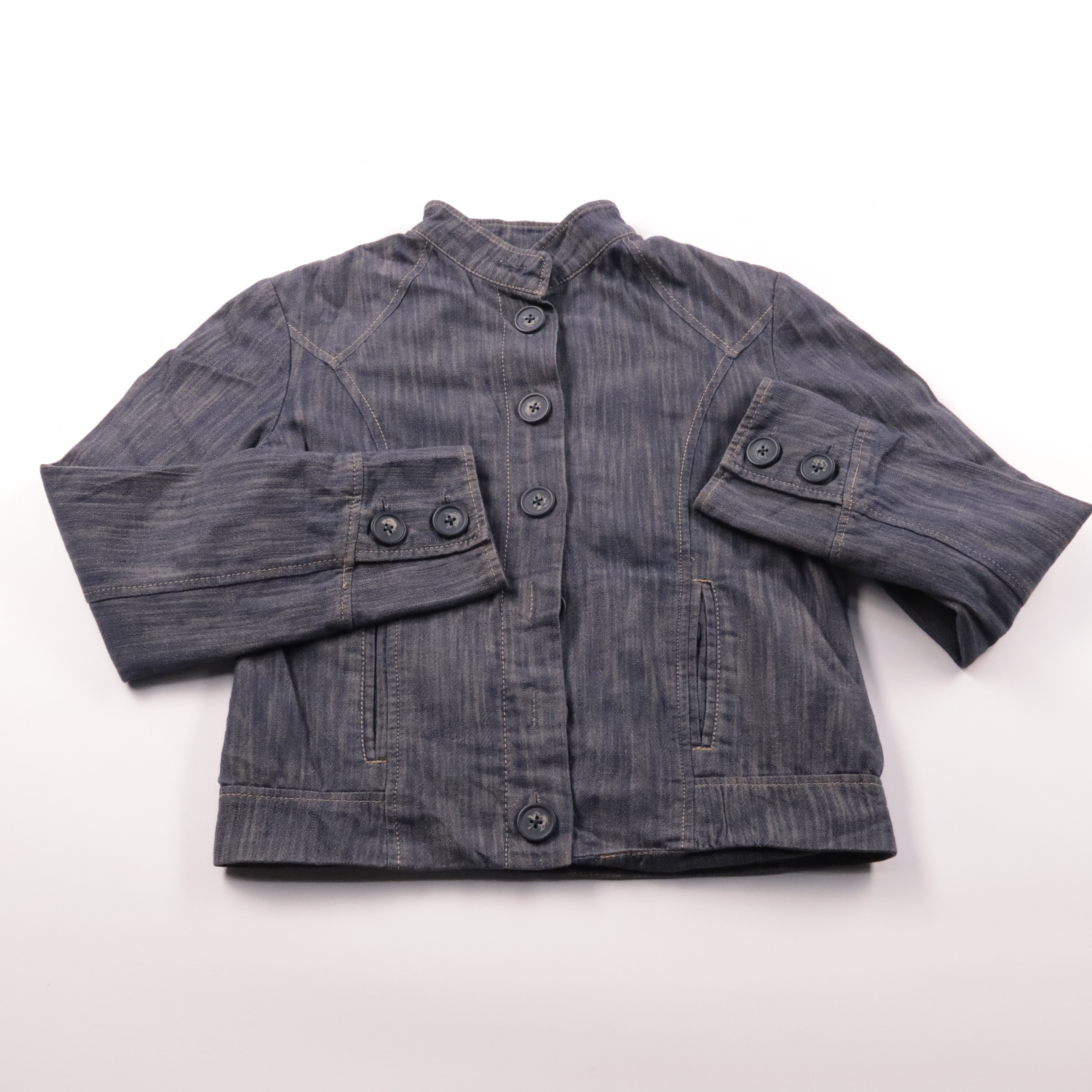 Джинсовая куртка Zero тёмно-синего цвета на пуговицах, с небольшим воротником и карманами. Подойдёт для прогулок весной и осенью, легко сочетается с джинсами, юбками и платьями. Плотный деним практичен в носке и хорошо держит форму.