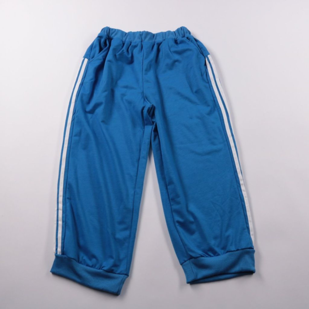 Спортивные брюки для мальчика без бренда, синего цвета с белыми лампасами по бокам и эластичным поясом. Подойдут для физкультуры, прогулок и активных игр, ткань мягкая и не сковывает движения. Пояс на резинке удобно быстро надевать и снимать.
