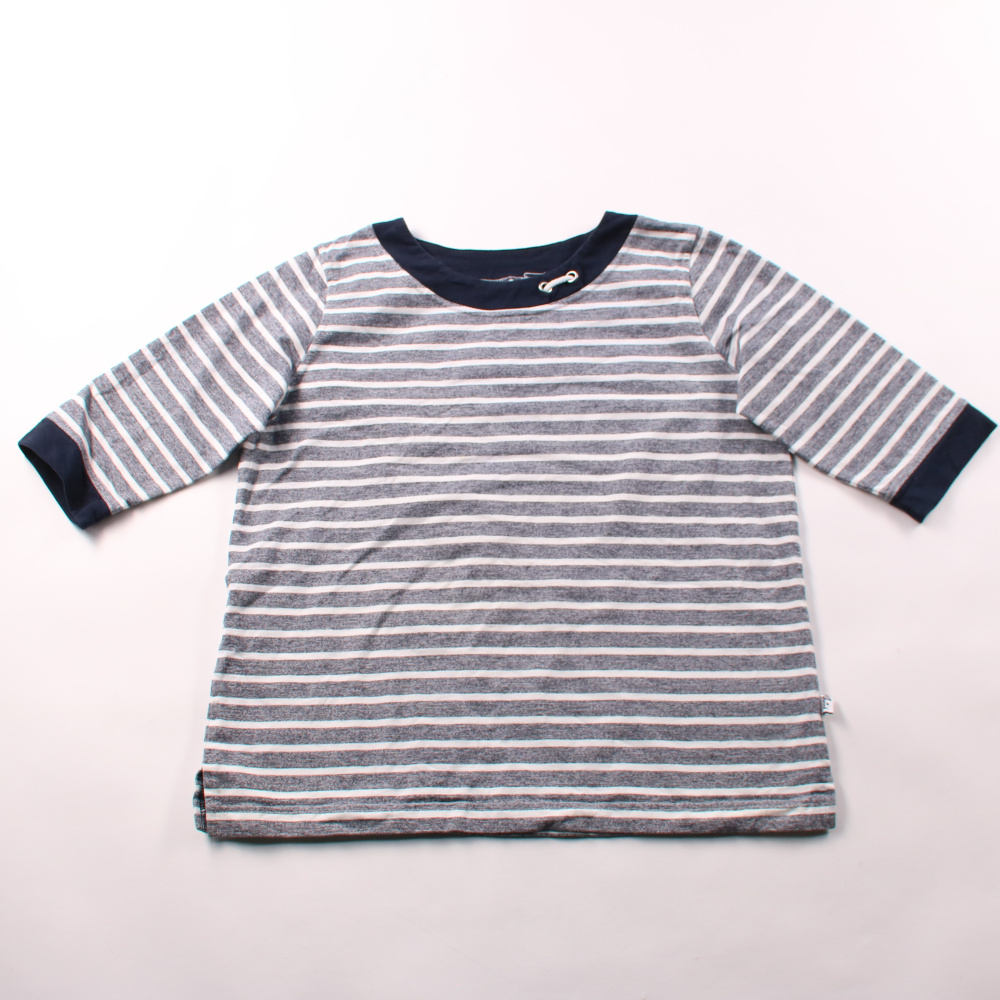 Полосатый детский лонгслив из трикотажа в серо-белой гамме с тёмной окантовкой по горловине и манжетам. Подойдёт для сада, прогулок и дома в прохладную погоду, легко сочетается с джинсами и спортивными брюками. Практичный вариант на каждый день благода...