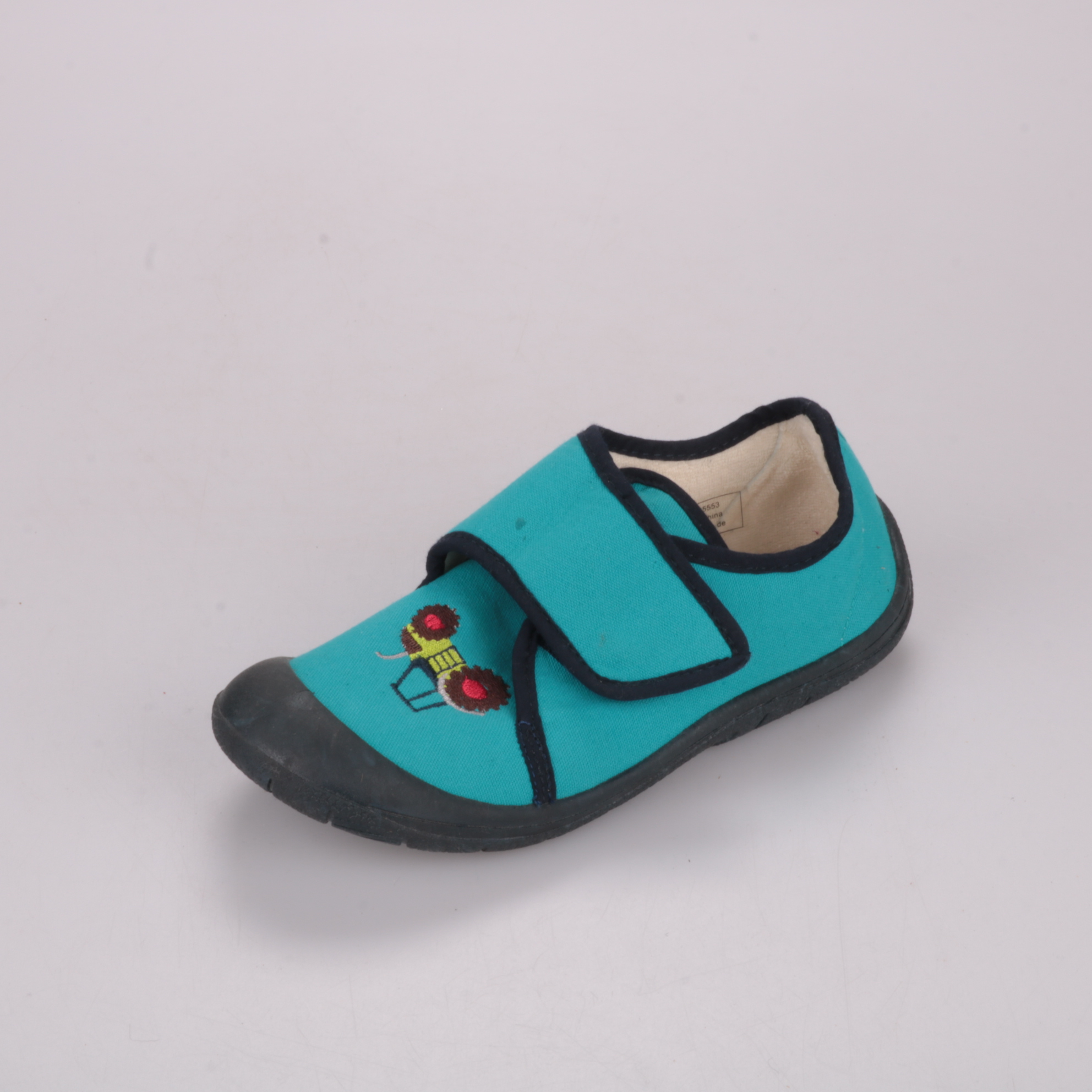 Домашние тапочки Jakoo бирюзового цвета на липучке, с прорезиненным носком и небольшим рисунком. Подойдут для дома или детского сада, удобно быстро надевать и снимать. Нескользящая подошва помогает увереннее ходить по гладкому полу.