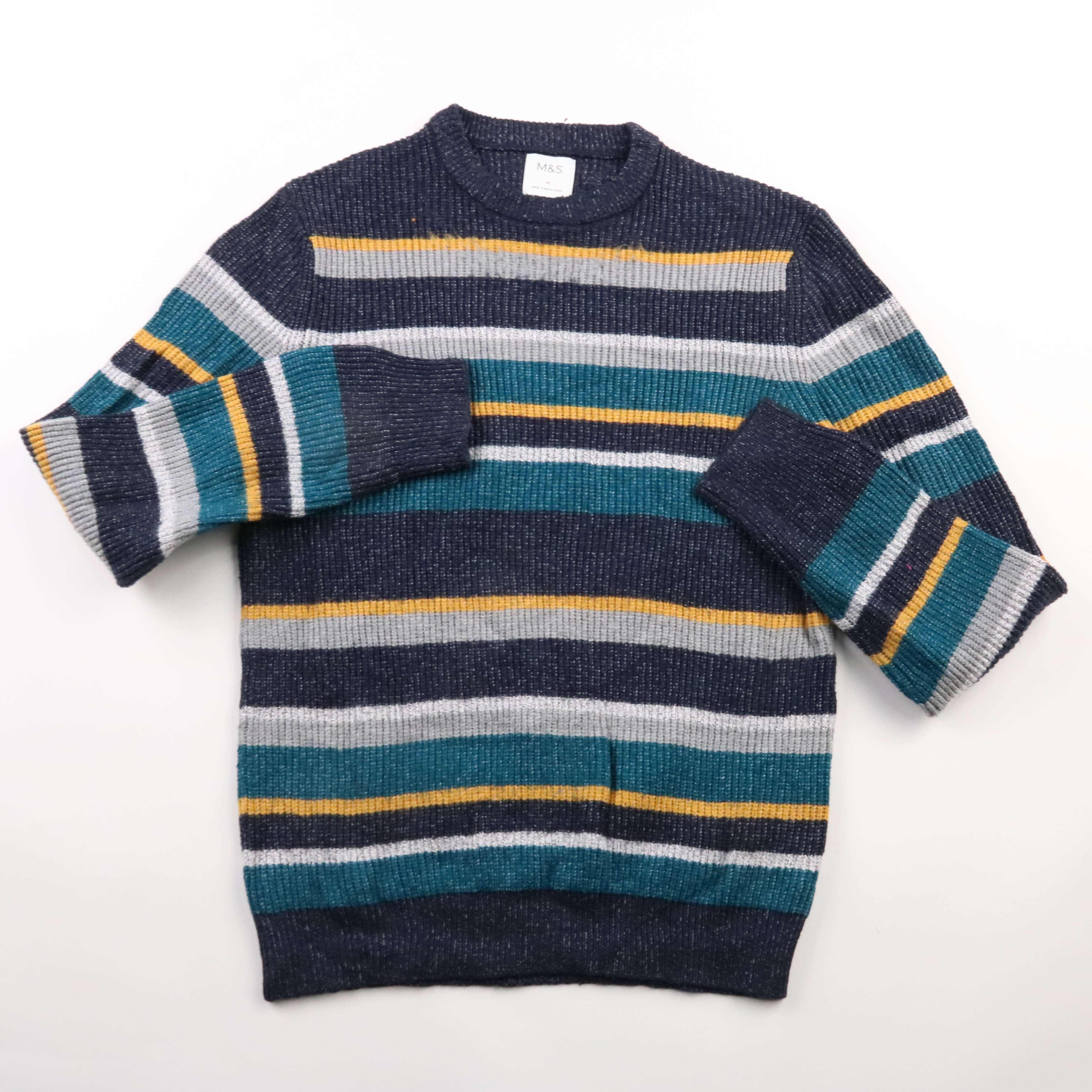 Детский вязаный свитер M&S в полоску (синий/бирюзовый/серый/жёлтый) с круглым вырезом. Подойдёт для школы и прогулок в прохладную погоду, удобно носить как самостоятельный слой или под куртку. Практичный в уходе: можно стирать в машине, материал мягкий...