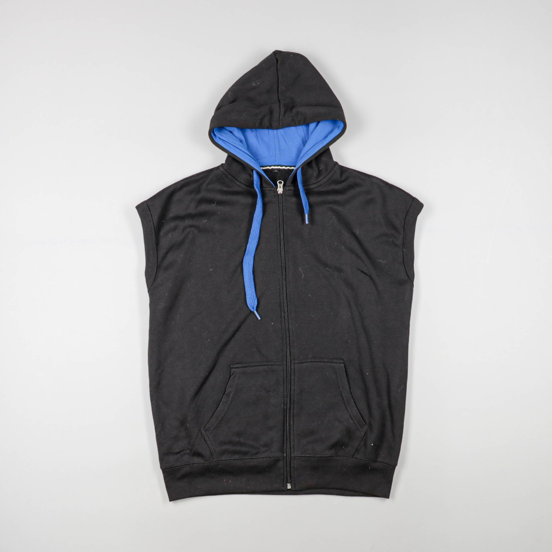 Толстовка без рукавов на молнии с капюшоном, бренд не указан. Подойдёт для школы, прогулок и спорта в прохладную погоду, удобно носить поверх футболки. Практичный плюс — карман-«кенгуру» и капюшон с завязками.