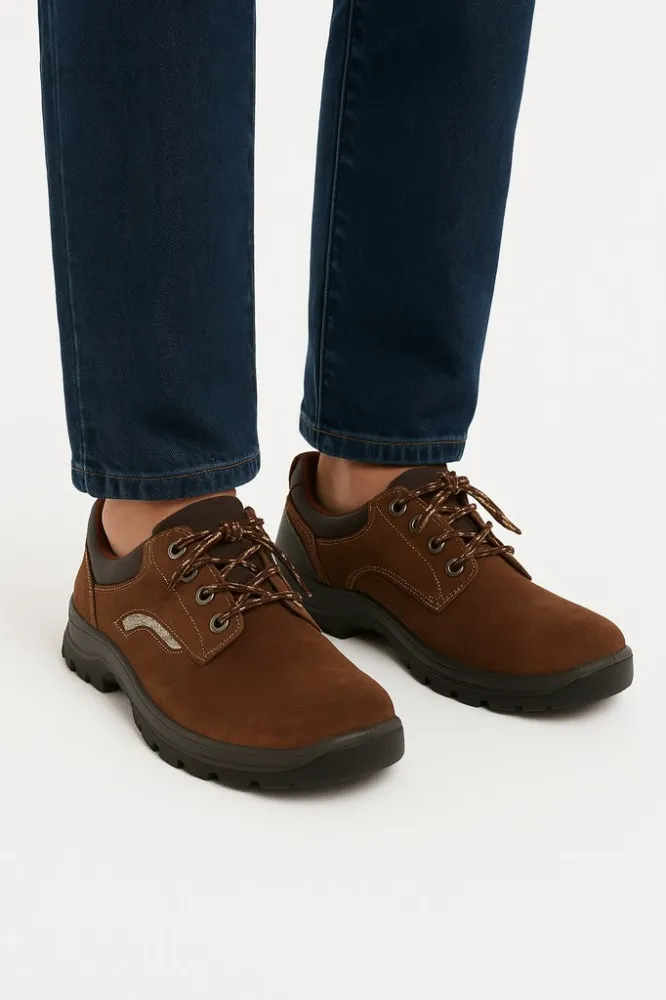 Мужские рабочие полуботинки Powerfix из коричневой замши на шнуровке и с высокой защитной подошвой. Подойдут для работы и повседневной носки в прохладную погоду, когда нужна устойчивость и защита стопы. Рельефный протектор даёт хорошее сцепление с пове...