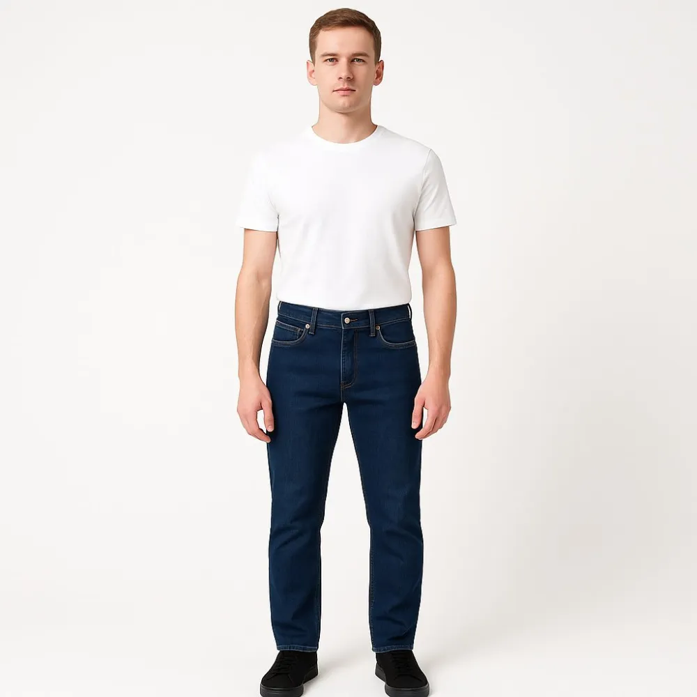 Мужские джинсы из тёмно-синего денима со слегка зауженным к низу кроем и классической посадкой. Подойдут для повседневной носки и офиса в стиле casual, хорошо сочетаются с футболками и рубашками. Практичный плюс — ткань с добавлением эластана немного т...