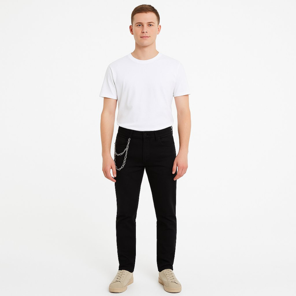 Мужские джинсы Only Denim чёрного цвета, зауженная посадка, есть декоративная цепочка сбоку. Подойдут для повседневных образов и более строгого casual за счёт однотонного цвета. Практичный плюс — немаркий оттенок и удобная посадка на каждый день.