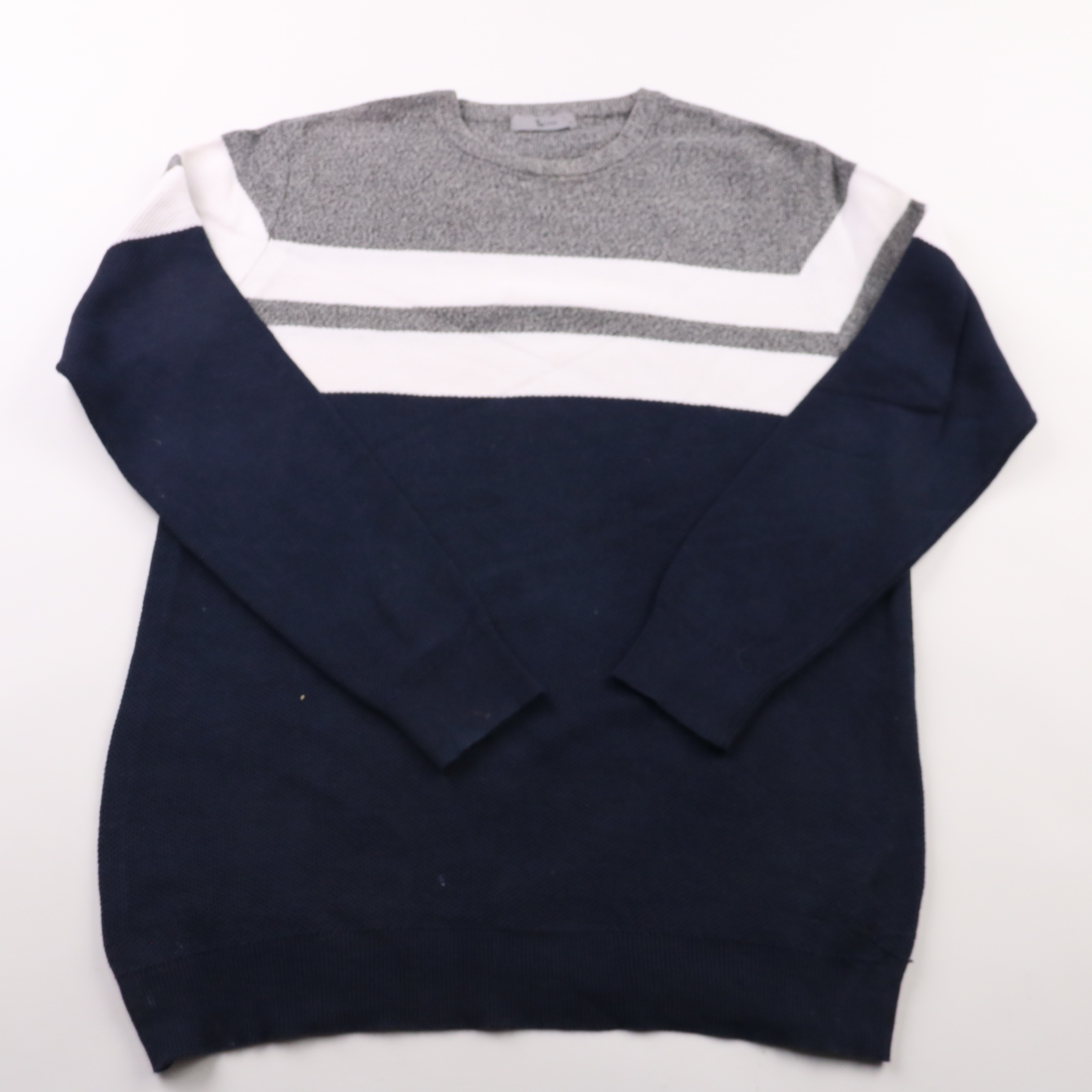 Мужской джемпер Tu с контрастными полосами на груди в серо-бело-синей гамме. Подойдёт для повседневной носки и офиса в стиле casual, хорошо сочетается с джинсами и брюками. Хлопковый трикотаж комфортный и дышащий, удобен в носке.