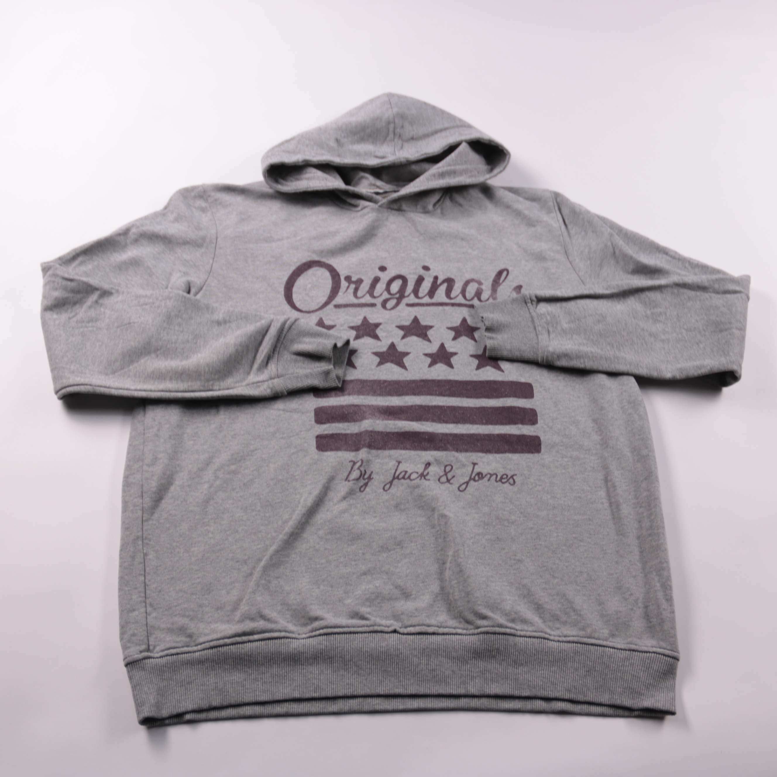 Мужское худи Jack & Jones серого цвета с принтом Original и капюшоном. Подойдёт для повседневной носки и прогулок в прохладную погоду, удобно сочетать с джинсами и спортивными брюками. Практичный плюс — мягкая ткань и манжеты/низ на резинке, которые хо...